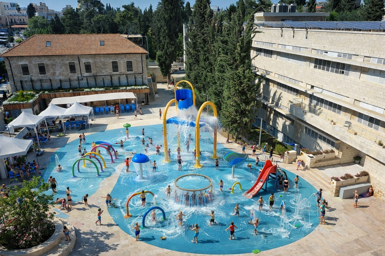 Der derzeitige Innenhof wird bald über eine Vielzahl von Wasserattraktionen verfügen, darunter interaktive Planschzonen, Rutschen für alle Altersgruppen und ein zentraler Brunnen. Geplant sind auch schattige Liegebereiche für die Eltern und natürlich werden alle Unterrichtsstunden entsprechend angepasst – Schwimmkenntnisse werden fächerübergreifend zur Kernkompetenz.